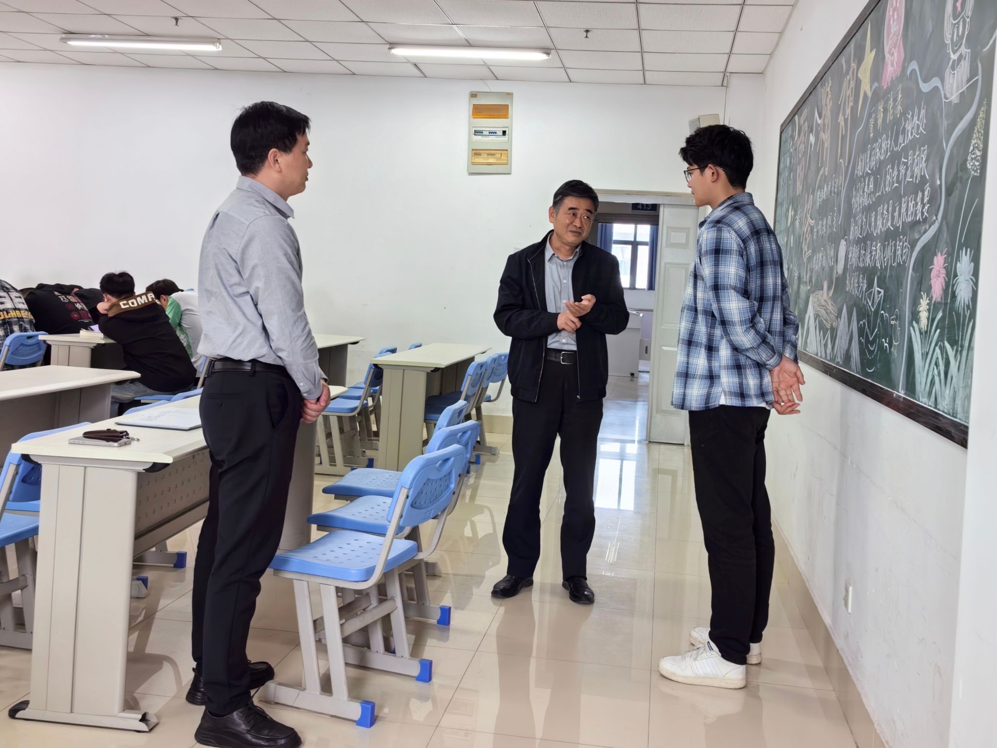 本網(wǎng)訊(馬克思主義學(xué)院:沈成成 審核:葛軍 佘東)為深入貫徹落實(shí)習(xí)近平總書記關(guān)于學(xué)校思政課建設(shè)的重要指示精神,推進(jìn)思政課課堂教學(xué)提升行動和院領(lǐng)導(dǎo)聯(lián)系思政課教師制度實(shí)施,4月8日下午,黨委書記許衛(wèi)深入教學(xué)一線聽取馬克思主義學(xué)院徐強(qiáng)老師主講的“中共黨史”課程。馬克思主義學(xué)院院長劉仁三陪同聽課。