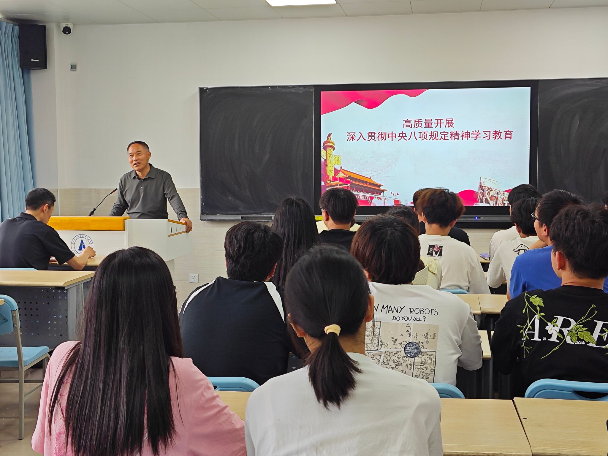 洪玉明立足學院工作實際,圍繞中央八項規定精神的內涵、中央八項規定精神對高校的重要性以及如何餞行中央八項規定精神三個方面作了系統講解和深入闡釋。他指出,全體黨員必須深刻理解中央八項規定精神的核心要義與時代價值,將其內化于心、外化于行,切實貫穿到日常學習、工作和生活的各個環節;堅守求真務實的作風,秉持勤儉節約的美德,專注本職工作;樹立正確的價值觀,提升專業素養,傳播正能量,為國家發展貢獻自己的力量,在實現個人職業夢想的同時,為實現中華民族偉大復興的中國夢添磚加瓦。