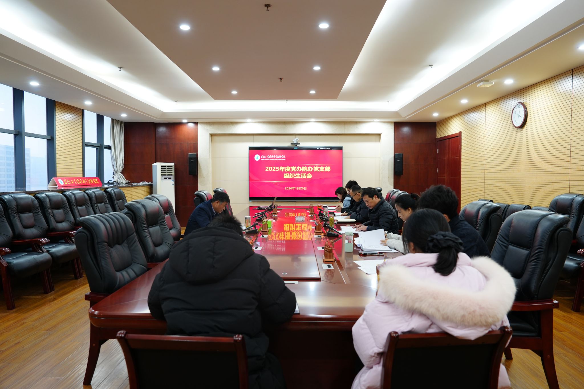 1月26日下午,黨辦院辦黨支部在教學主樓第一會議室召開 2025 年度組織生活會暨民主評議黨員會議。院黨委書記許衛(wèi)以普通黨員身份參會,與支部黨員一起交流思想,檢視剖析問題,聽取意見建議,并作點評講話。會議由黨支部書記張旭剛主持,支部全體黨員參加。