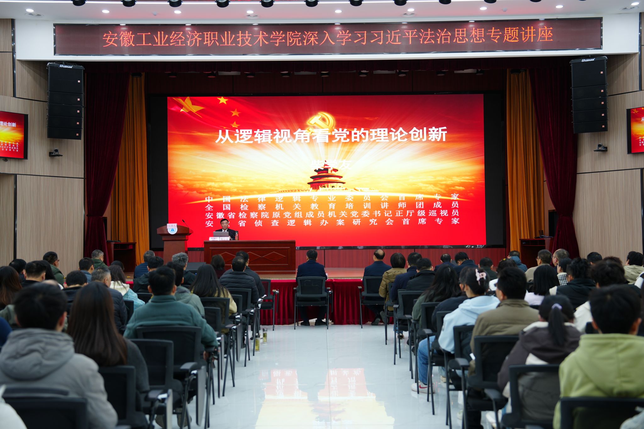 12月9日上午,安徽省人民檢察院原黨組成員、專職檢委、機關黨委書記、正廳級巡視員、國家一級高級檢察官、中國法律邏輯專業委員會首席專家、安徽省偵查邏輯辦案研究會首席專家柴學友應邀來到安徽工業經濟職業技術學院為干部師生作題為《從邏輯視角看黨的理論創新——兼析黨的二十屆四中全會精神》的專題講座。黨委書記許衛主持講座。院領導,全體中層干部、思政課教師、輔導員及學生代表近200人聆聽了講座。