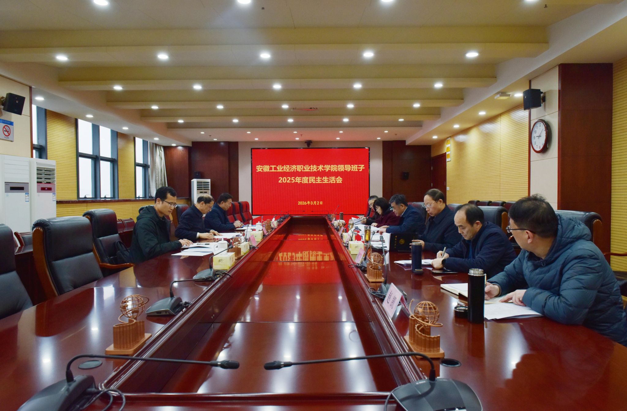 3月2日,安徽工業(yè)經(jīng)濟(jì)職業(yè)技術(shù)學(xué)院召開(kāi)領(lǐng)導(dǎo)班子2025年度民主生活會(huì)。省地礦局黨委書(shū)記、局長(zhǎng)朱學(xué)文,二級(jí)巡視員朱省峰,人事處一級(jí)主任科員尹大勇到會(huì)指導(dǎo)。會(huì)議由學(xué)院黨委書(shū)記許衛(wèi)主持,學(xué)院領(lǐng)導(dǎo)班子全體成員參會(huì)。