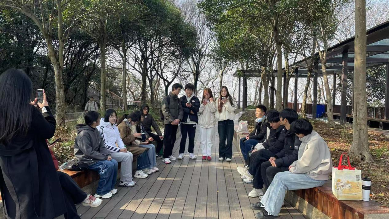 青山凝翠,精神永傳。大家統一佩戴團徽,神情莊嚴,沿陵園臺階拾級而上。通往山頂的石階逐漸收窄,來自文教學院的何健昕同學深有感悟地說,“我們輕裝上山都覺得艱難,先烈們負重沖鋒會是何等壯烈!”登頂瞬間,豁然開朗的視野帶來強烈震撼,俯瞰合肥市區,高樓與青山交相輝映,抗戰紀念碑在蒼松環抱中愈發莊重。數智財商學院的朱斌同學駐足良久,喃喃說道,“若他們看見今天的中國,該有多么欣慰。”在山頂上,學子們自發組織唱起紅歌,從“我的祖國”“團結就是力量”“歌唱祖國”等歌曲中感悟信仰力量,最后大家在“強軍戰歌”的集體合唱中結束此次行程。