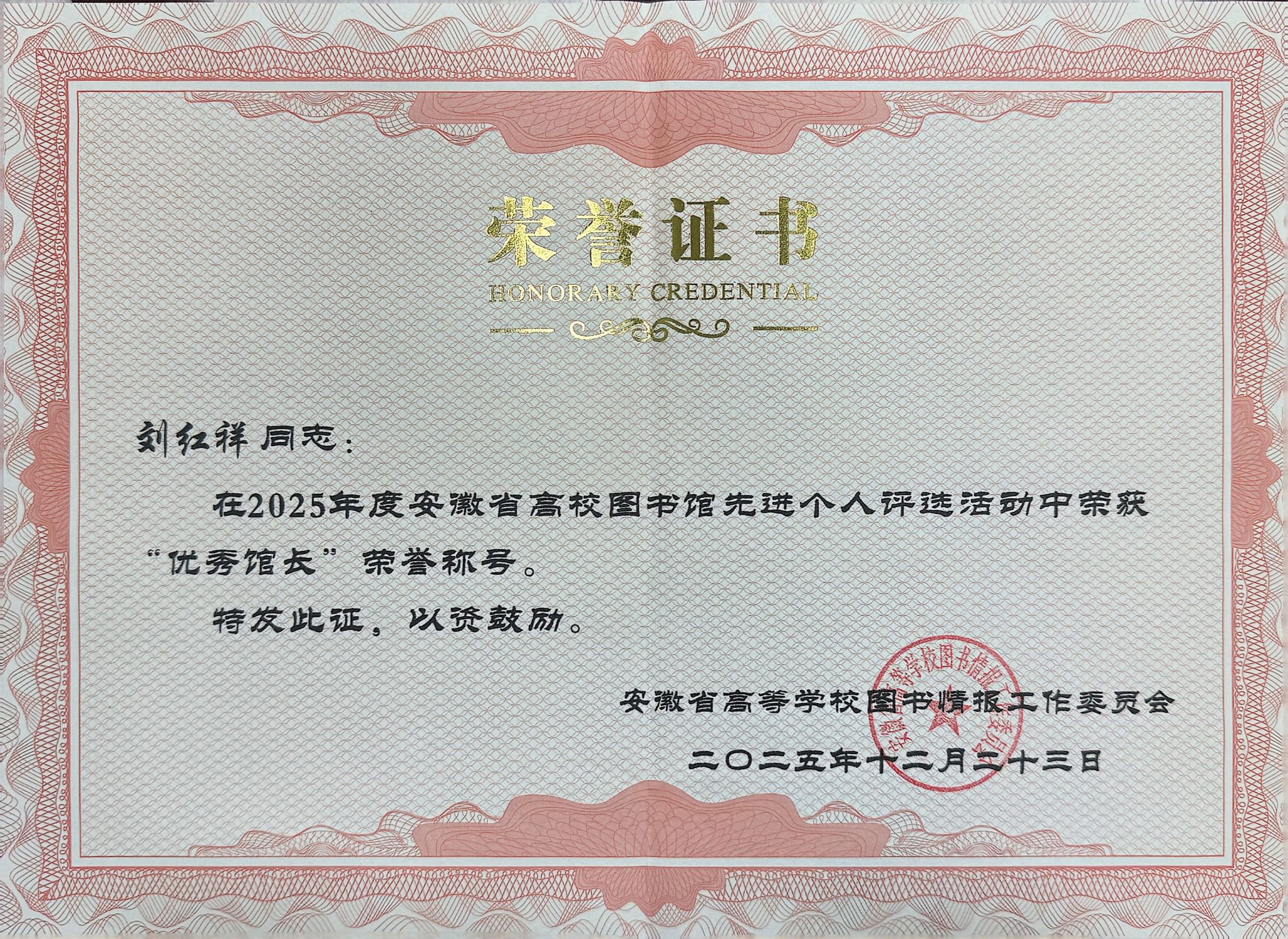 1月8日至10日,2025年安徽省高校圖書館館長年會(huì)在宿州市舉行。省委宣傳部、省教育廳相關(guān)領(lǐng)導(dǎo)出席指導(dǎo),來自全省60余所高校的120余名圖書館負(fù)責(zé)人及館員參會(huì)。學(xué)院圖書館榮獲安徽省高校圖書館2025年度“先進(jìn)集體”稱號(hào),圖書館負(fù)責(zé)人劉紅祥榮獲“優(yōu)秀館長”稱號(hào)。