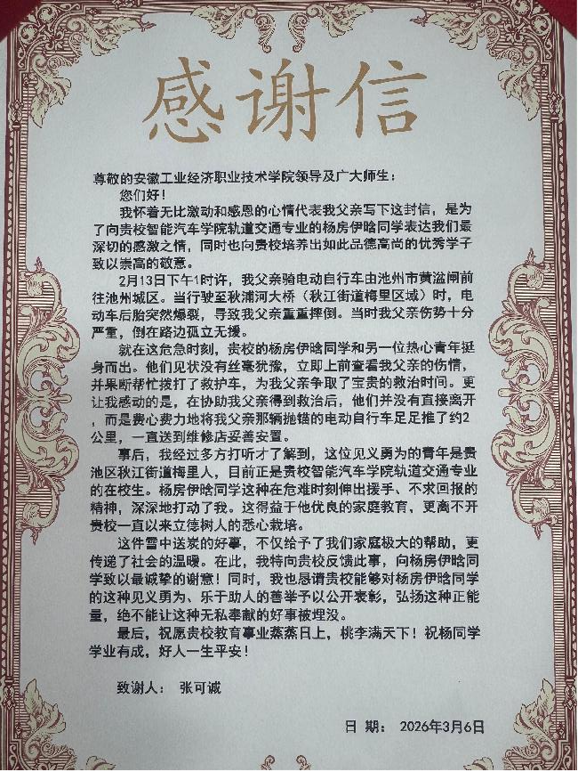 寒假期間,智能汽車學院城市軌道交通機電技術專業22562班學生楊房伊晗路遇一名因電動車爆胎摔倒受傷的行人,他主動伸出援手,事后婉拒酬謝。近日,受助者家屬專門向學校寄來感謝信,對楊房伊晗的善行表達謝意。
