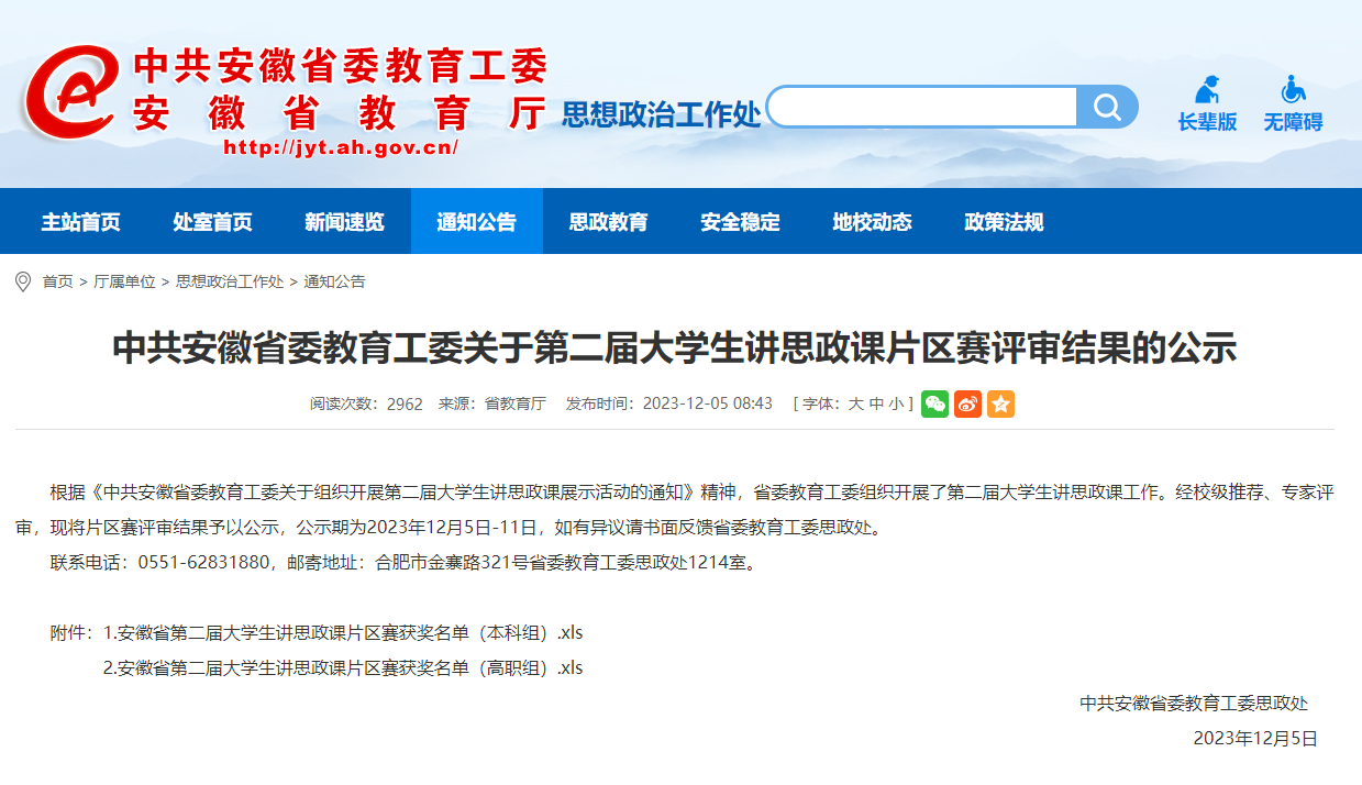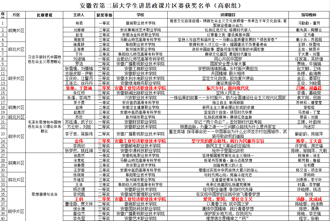 本網訊(馬克思主義學院:李燕 審核:肖勇 佘東)日前,安徽省委教育工委公示了安徽省第二屆大學生講思政課片區賽評審結果,安徽工業經濟職業技術學院馬克思主義學院四項參賽作品中三項獲獎,其中二等獎1項、三等獎2項,獲獎數及等次創歷史新高,居高職院校前列。