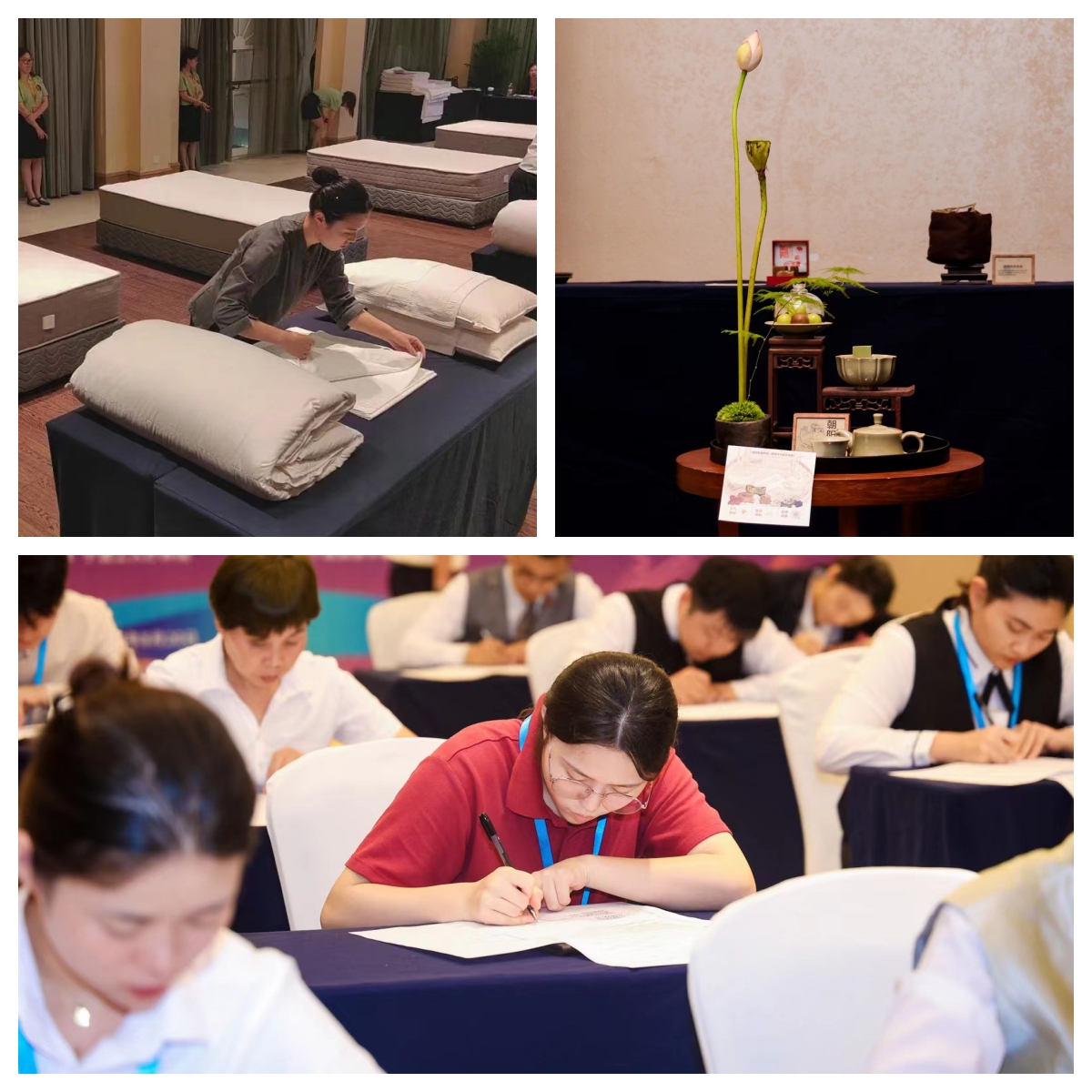 左上:王羽在比賽中進行中式鋪床 右上:王羽同學小景布置作品 下:王羽同學參加比賽理論測試