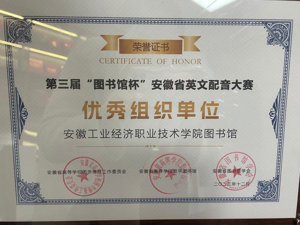 本網(wǎng)訊(圖書(shū)館:汪瑞 審核:陶潛毅 佘東)12月24日,第三屆“圖書(shū)館杯”安徽省英文配音大賽在安徽省圖書(shū)館圓滿落幕,學(xué)院圖書(shū)館榮獲大賽優(yōu)秀組織獎(jiǎng)。