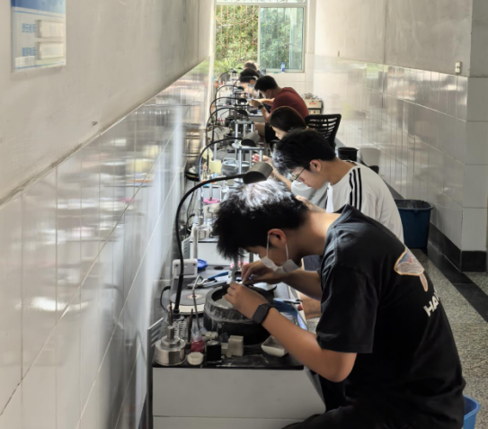 自備賽之初,學(xué)院高度重視,為參賽師生提供了全方位的支持。寶石琢磨工賽項(xiàng)有203項(xiàng)技術(shù)評(píng)分點(diǎn),要求選手既要具備精湛的技藝以及設(shè)計(jì)畫(huà)圖的功底,又要具備扎實(shí)的寶石琢磨技能。指導(dǎo)教師為學(xué)生團(tuán)隊(duì)制定了詳細(xì)的訓(xùn)練計(jì)劃和方案,不斷提升學(xué)生們的技能和專業(yè)知識(shí)。暑期實(shí)訓(xùn)室改造,為保證訓(xùn)練照常進(jìn)行,學(xué)生們克服困難,直接在走道里進(jìn)行訓(xùn)練。通過(guò)不斷實(shí)踐和反復(fù)磨練,他們?cè)诖筚愔邪l(fā)揮出最佳水平。