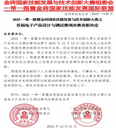 近日,2025年一帶一路暨金磚國家技能發(fā)展與技術(shù)創(chuàng)新大賽“智能產(chǎn)品設(shè)計(jì)與調(diào)試”賽項(xiàng)決賽圓滿落幕。學(xué)院選派4名學(xué)生參與角逐,在與全國300余名選手的激烈競(jìng)爭(zhēng)中脫穎而出,最終獲一等獎(jiǎng)1名、二等獎(jiǎng)1名、三等獎(jiǎng)2名。