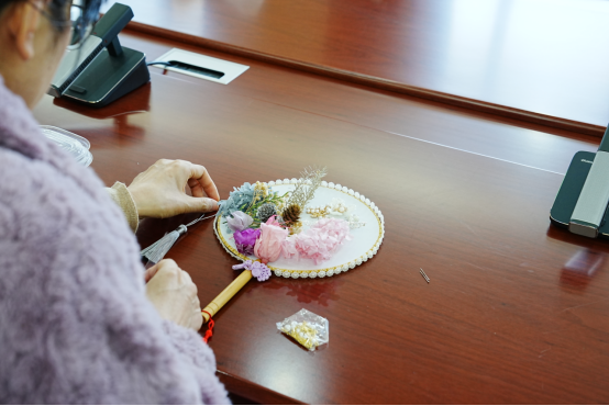 活動現場花香四溢,氣氛溫馨。女職工們充分發揮想象力和創造力,將一朵朵鮮花錯落有致地搭配在一起,制作出一個個獨具匠心的花藝作品。在團扇制作環節,大家用干花、膠水等材料,在團扇上進行創作,將對生活的美好祝愿融入“花語”中,繪出一幅幅精美的干花團扇作品。