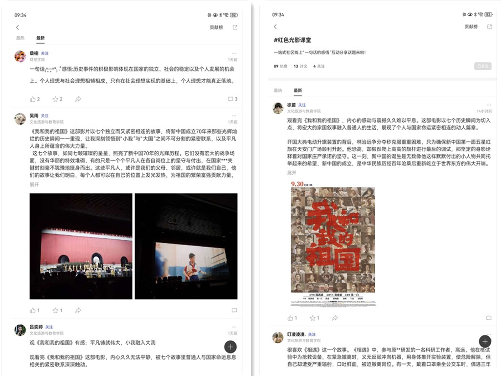 ”個人理想與社會理想相輔相成,只有在社會理想實現的基礎上,個人理想才能真正落地。”看完電影后,來自財經學院的魏璇同學感慨滿懷,她打開手機,登陸院團委設置的“一句話的感悟”線上分享版塊,留下了自己的感言。“影片讓我深刻感受到,個人命運與祖國發展緊密相連。無數普通人在各自崗位上發光發熱,共同鑄就祖國的輝煌。這不僅是對歷史的致敬,更是對愛國精神的傳承,它會激勵著我們在新時代為祖國的繁榮繼續拼搏。”文化旅游與教育學院的陳智同學也寫下了自己內心滿滿的感動。觀影同學圍繞思政導師“微導學”的內容,通過“一站式學生社區”線上平臺熱烈表達自己內心的感受,激發出更多的思考和感悟。教師團隊也可以適時參與引導,形成“觀影有感、發言有思、討論有獲”的良性循環。