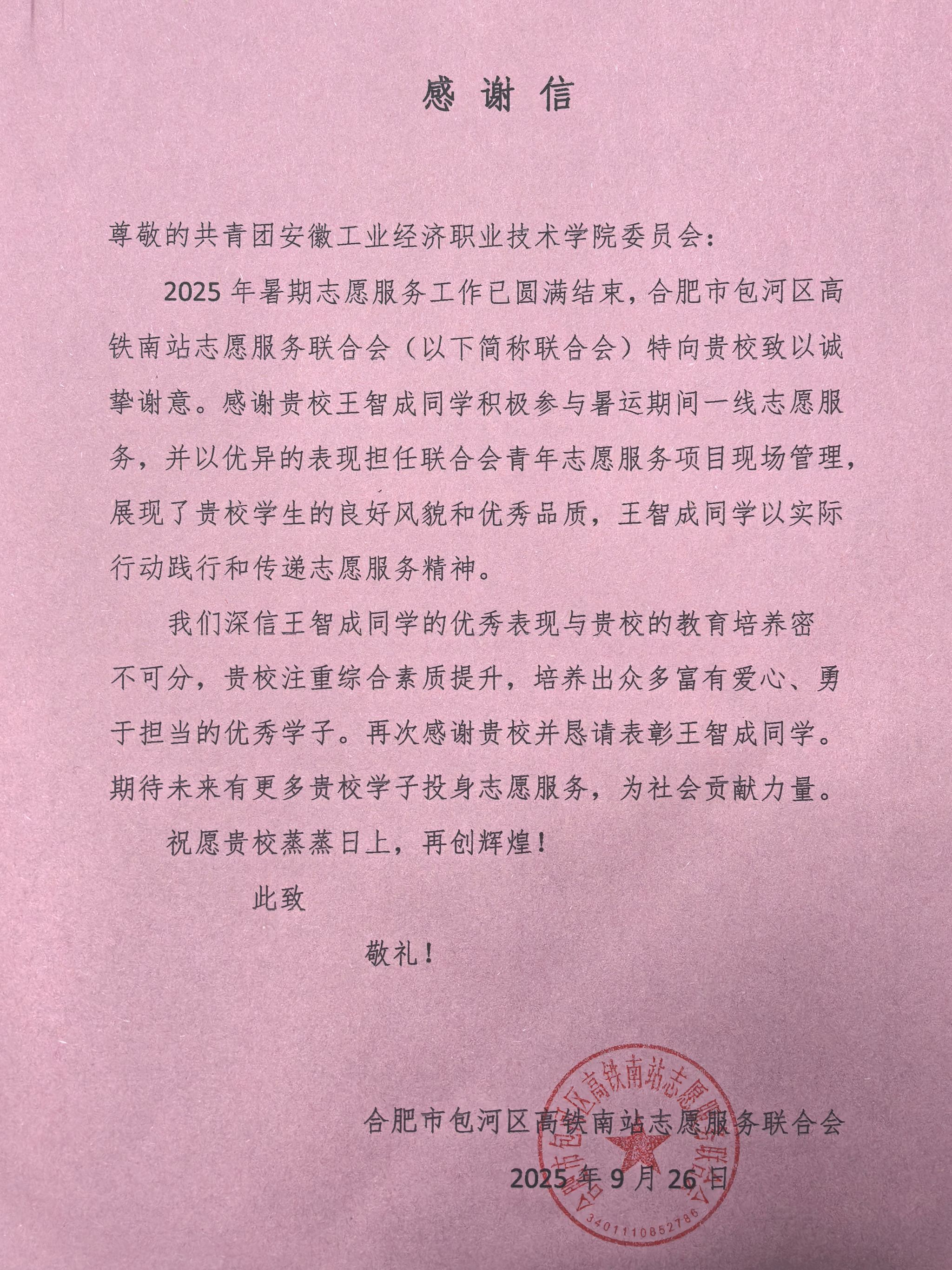 近日,一封來(lái)自合肥南站的感謝信送至我院,這封信對(duì)計(jì)算機(jī)與人工智能學(xué)院2024級(jí)王智成同學(xué)在暑期志愿服務(wù)中的突出表現(xiàn)予以贊揚(yáng)和感謝。