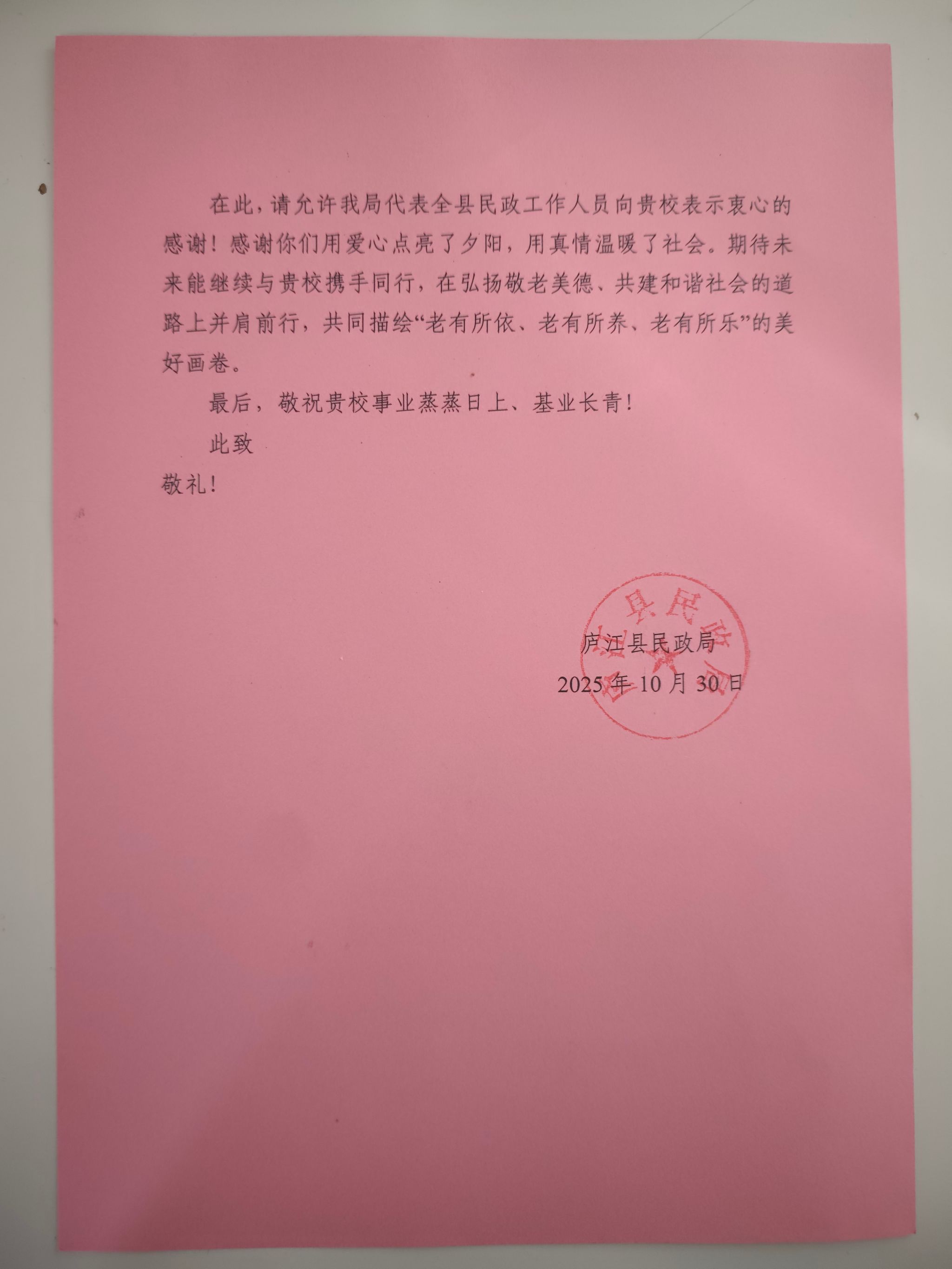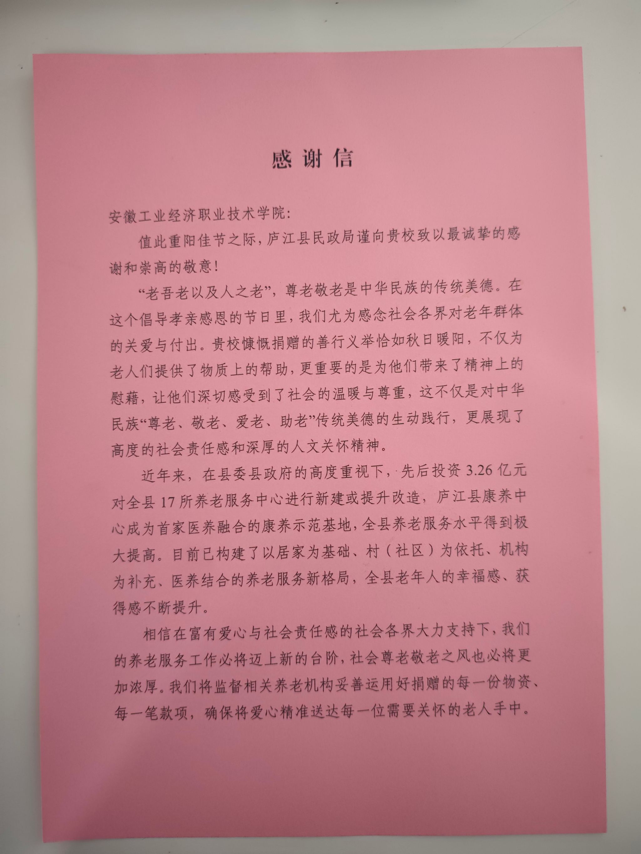此次重陽節慰問活動,不僅為老人們帶去了歡樂與關懷,更彰顯了智能汽車學院的社會擔當。事后,包括合肥新聞聯播、大皖新聞、長江網、中國民政等多家媒體紛紛報道此次慰問活動,進一步擴大了活動的社會影響力,展現了新時代高校師生服務社會、奉獻社會的良好風貌。廬江縣民政局也給學院發來感謝信,對學院積極參與敬老愛老公益活動表示高度認可,并對我校師生的暖心舉措給予充分肯定。