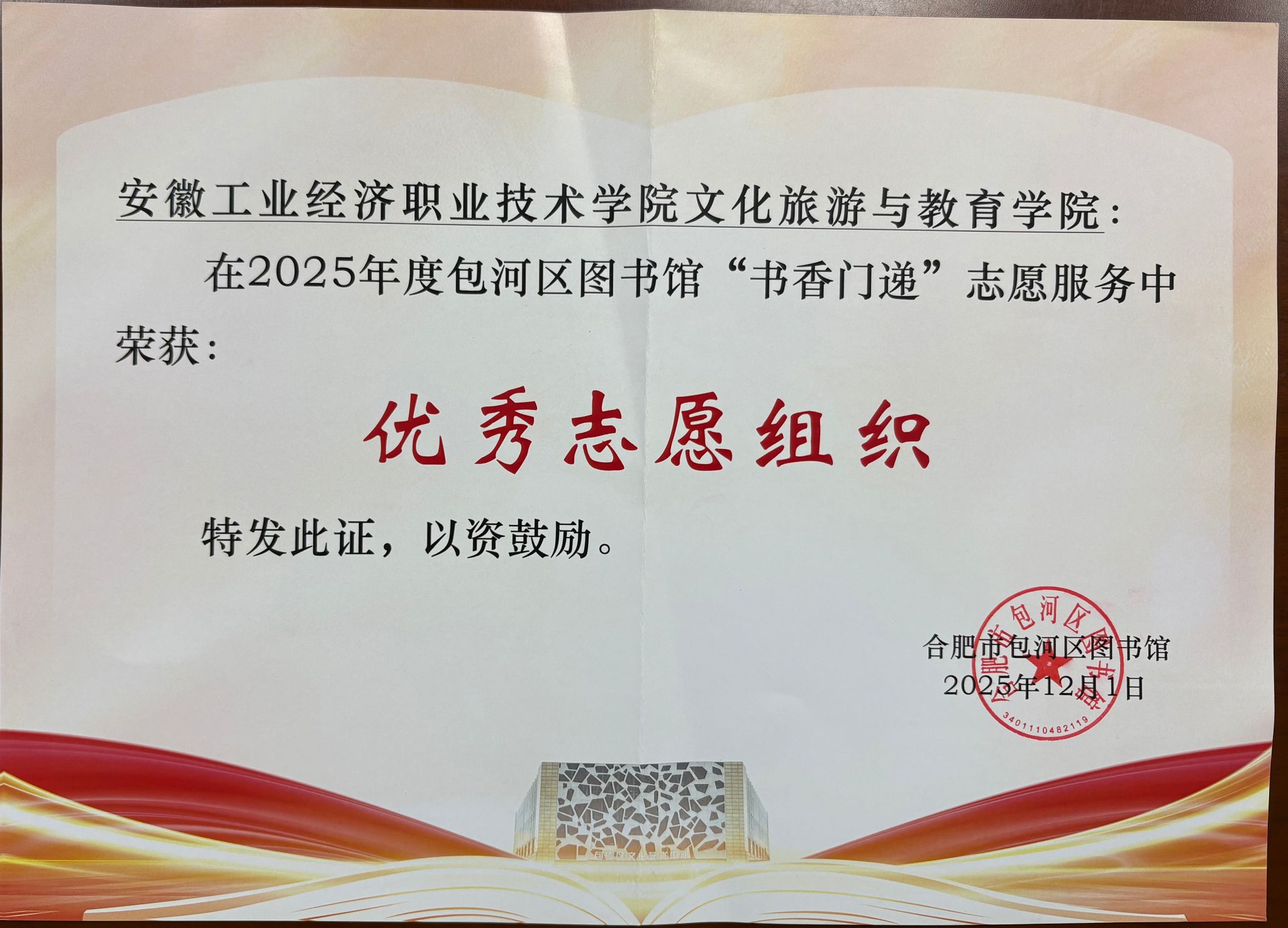 為深入踐行公益助殘理念,傳遞社會溫情力量,12月1日,“書香門‘遞’ ‘益’路同心”年度文藝助殘匯演在包河區圖書館舉行。安徽工業經濟職業技術學院文化旅游與教育學院憑借在助殘志愿服務中的扎實舉措、突出成效,獲評2025年度包河區圖書館“書香門遞”志愿服務優秀志愿組織,該院團總支書記汪君老師代表學院領獎。
