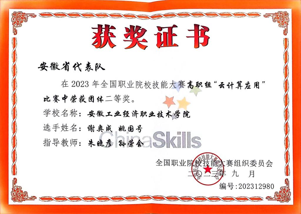 本網訊(計算機與藝術學院:孫榮會 審核:葛軍 佘東)9月20日,2023年全國職業院校技能大賽(高職組)云計算應用賽項在長春汽車工業高等專科學校落下帷幕。安徽工業經濟職業技術學院謝奧成、姚國號兩名同學代表安徽省參賽,榮獲該賽項二等獎的好成績。