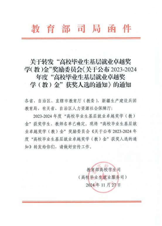 “全國高校畢業生基層就業卓越獎”由教育部高校學生司、教育部學生服務與素質發展中心共同指導,獎勵赴基層就業創業并做出突出業績的普通高校畢業生,旨在引導廣大高校畢業生到基層逐夢青春、歷練成才。