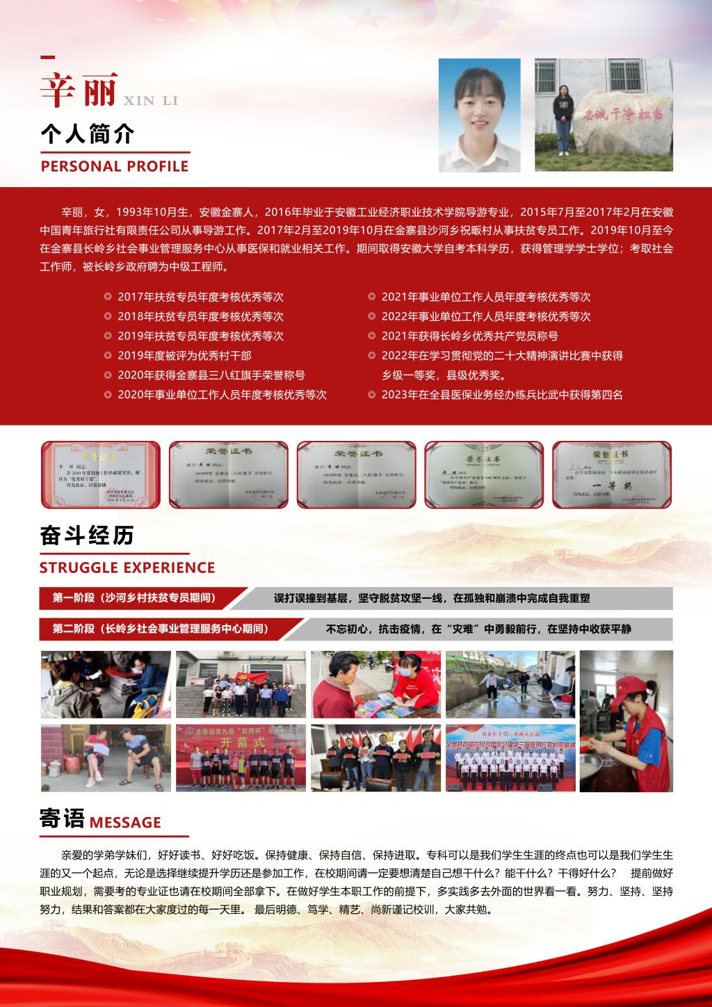 辛麗是我院2016屆畢業生,中共黨員,專科學歷,現在金寨縣長嶺鄉社會事業管理服務中心從事就業、醫保等相關工作。該同志自從事基層工作以來,吃苦耐勞,甘于奉獻,努力讓青春在基層廣闊大地上閃光。從村扶貧專員到事業單位工作人員,從脫貧攻堅一線到抗擊疫情一線再到鄉村振興建設,她時刻牢記自己是一名共產黨員,事事、處處、時時都以優秀共產黨員的標準嚴格要求自己,對工作兢兢業業,勤勤懇懇,較好地發揮出共產黨員的先鋒模范作用,表現出強烈的事業心和高度的政治責任感,工作中連續多年年度考核為優秀等次,并獲得“優秀村干部”“優秀共產黨員”和“金寨縣三八紅旗手”等稱號。