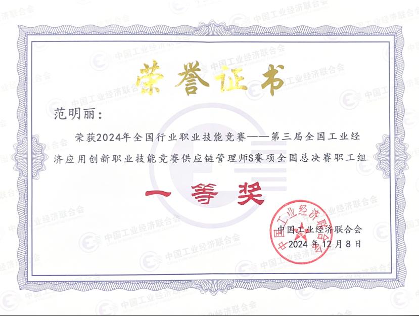 本網訊(財經學院:范明麗 審核:李學鋒 佘東)2024年全國行業職業技能競賽——第三屆全國工業經濟應用創新職業技能競賽供應鏈管理師S賽項全國總決賽于12月7日至8日在廣州市交通技師學院舉行。財經學院專業教師范明麗老師以第五名的好成績斬獲職工組一等獎,并榮獲安徽省技術能手稱號。