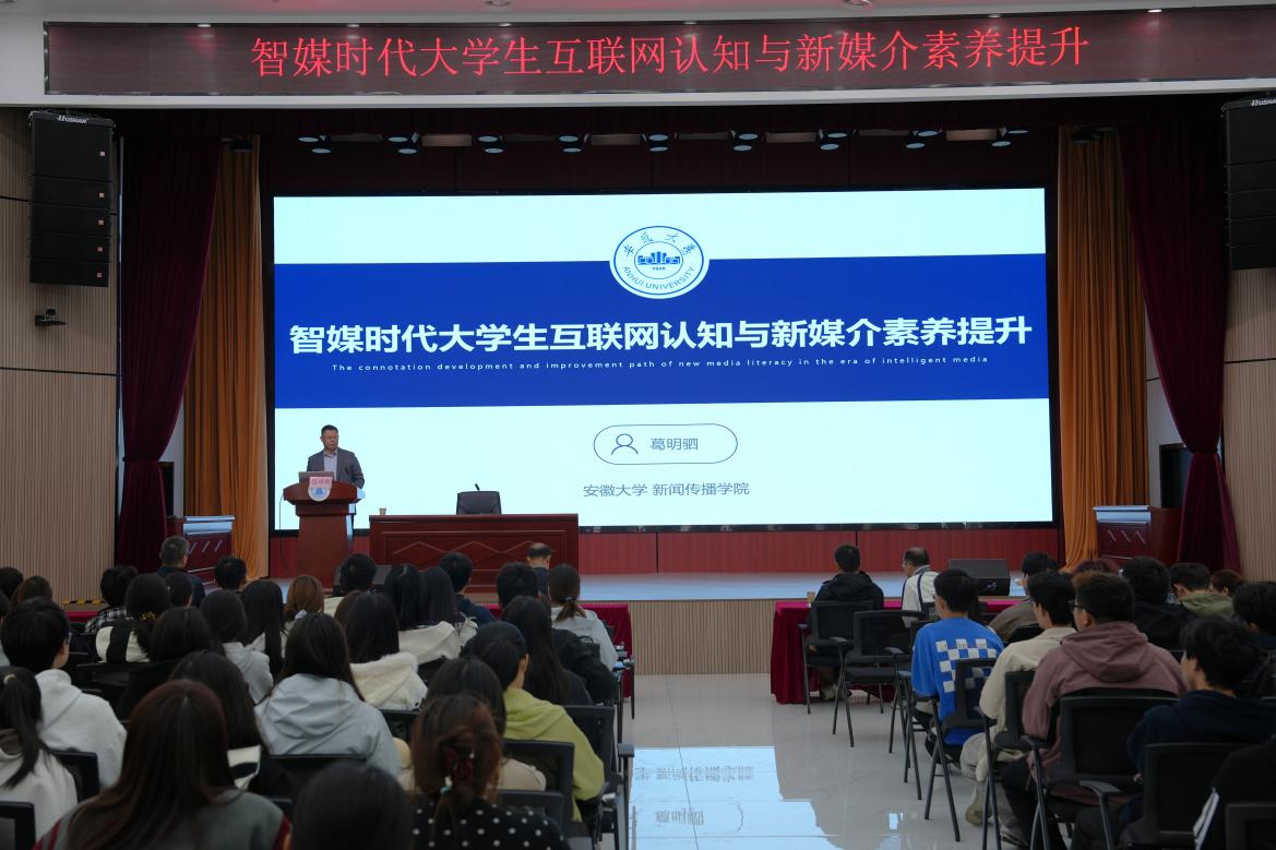 10月20日下午,學院舉辦第4期“樹人講堂”,安徽大學新聞傳播學院院長葛明駟教授來我院作題為“智媒時代大學生互聯網認知與新媒介素養提升”學術講座,學院200余名師生到場聆聽,黨委副書記、院長劉仁金主持。