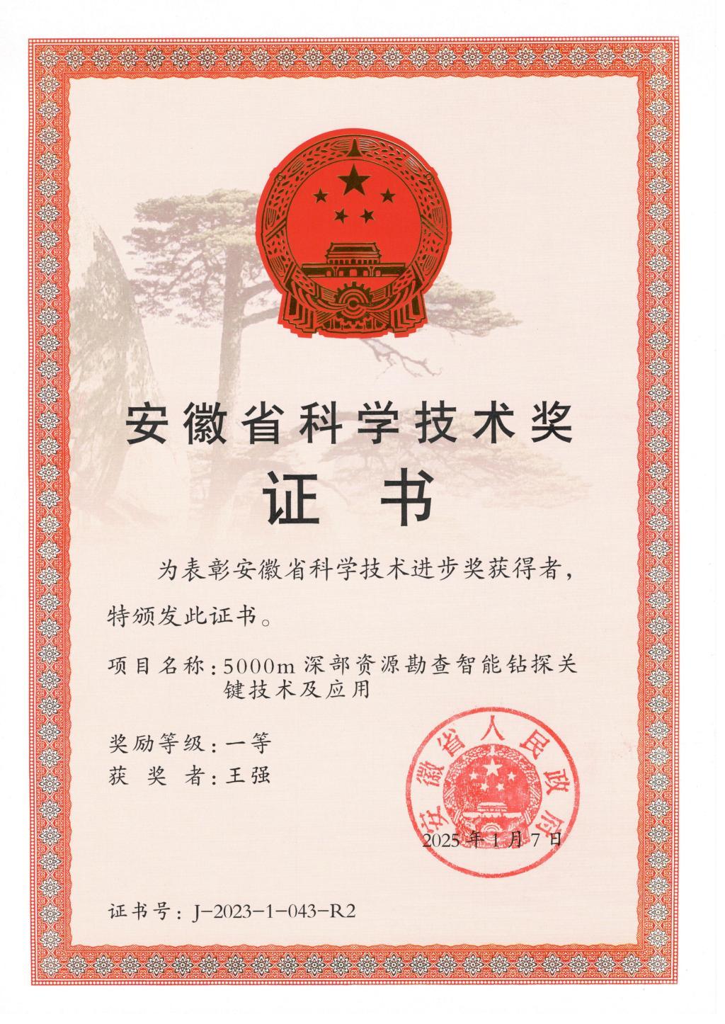 近日,安徽工業經濟職業技術學院王強參與的“5000m深部資源勘查智能鉆探關鍵技術及應用”榮獲2023年度安徽省科技進步獎一等獎。